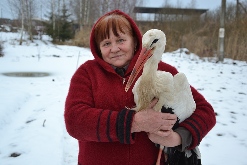 На дапамогу прыйшоў інтэрнэт, расказвае жанчына. Буслы з гнёздаў выкідваюць самае слабае птушаня. Менавіта яго і ўратавала. Паіла са шпрыца, выходжвала, частавала чарвякамі, мухамі, кавалачкамі мяса.