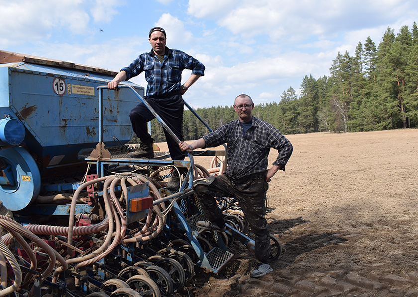 Валерый Шэдзько працуе на МТЗ-3022 з сеялкай трынаццаты год, а ўсяго ў гаспадарцы – тры дзясяткі гадоў. Крыху меншы стаж у Аляксандра Кандакова, які на МТЗ з баронамі рыхтуе глебу да сяўбы.