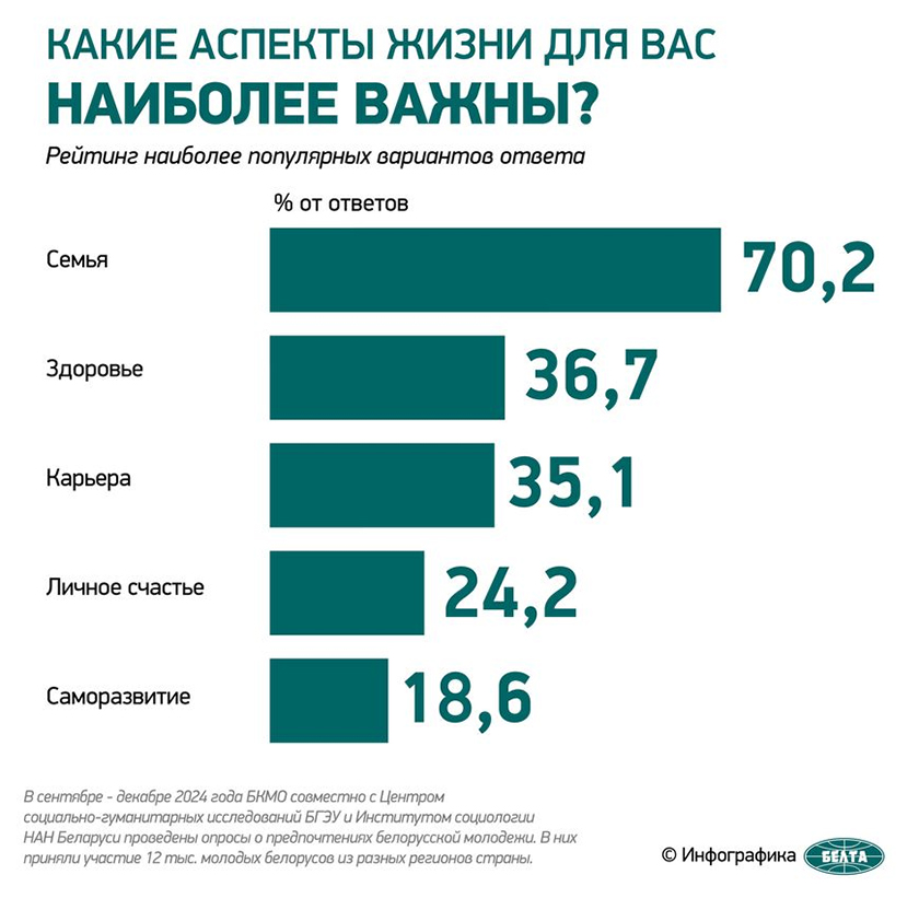Семья в структуре ценностей белорусской молодежи имеет высокую значимость. Об этом корреспонденту БЕЛТА сообщил председатель Белорусского комитета молодежных организаций (БКМО) Павел Алексо, комментируя данные соцопросов.