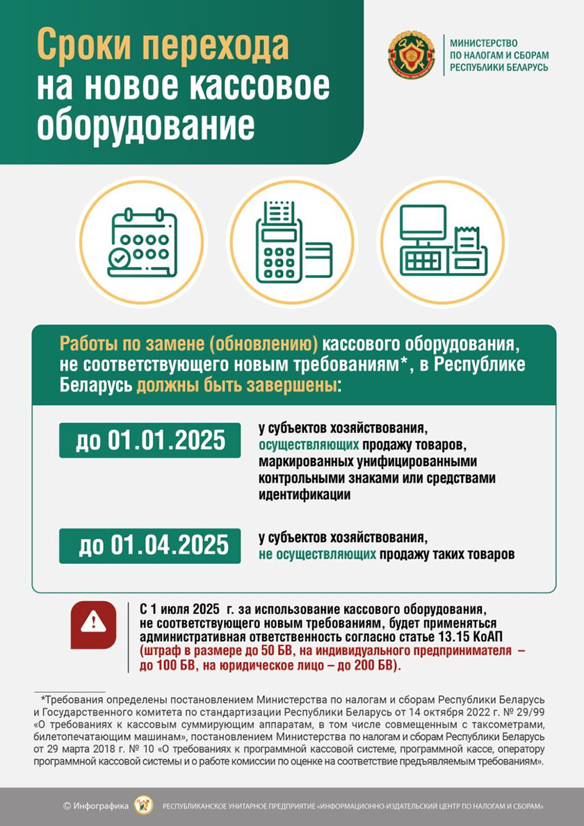 Министерство по налогам и сборам напоминает, что подготовиться к изменениям необходимо заблаговременно. Определены следующие сроки завершения работ по переходу на новое (доработанное под новые требования) кассовое оборудование: