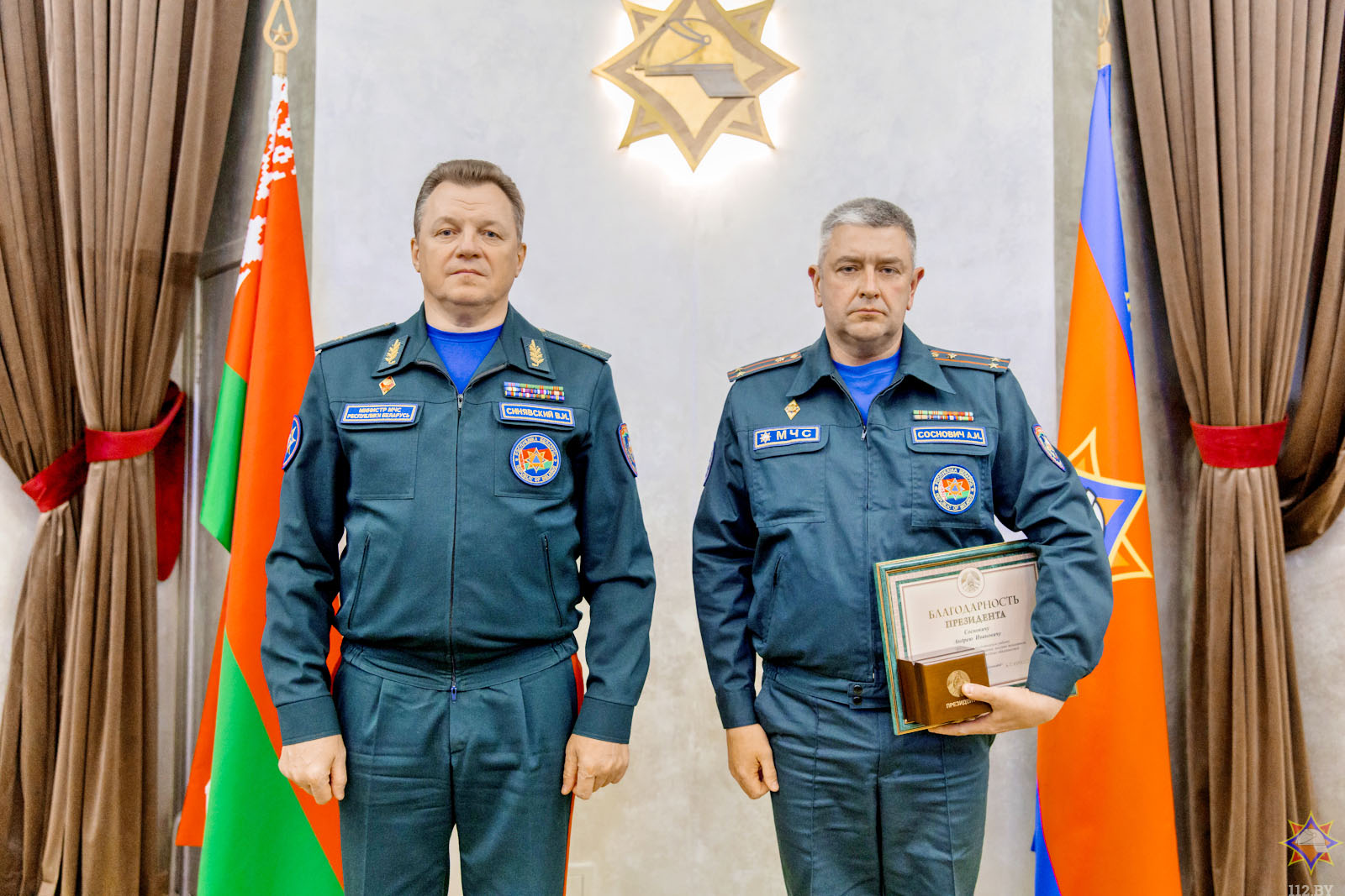 По поручению Президента Беларуси Александра Лукашенко Министр по чрезвычайным ситуациям Республики Беларусь Вадим Синявский в Минске в торжественной обстановке вручил начальнику Шумилинского районного отдела по чрезвычайным ситуациям подполковнику внутренней службы Андрею Сосновичу Благодарность Президента и ценный памятный подарок.