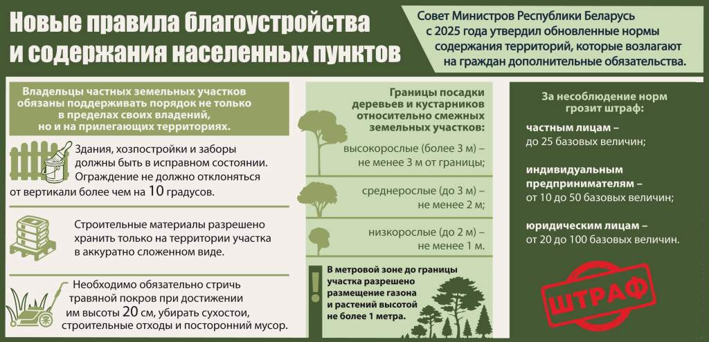 За нарушение правил благоустройства и содержание населенных пунктов, а равно невыполнение работ по поддержанию надлежащего санитарного состояния на территориях земель общего пользования населенных пунктов, в том числе на прилегающих к предоставленным гражданам (находящимся у них) земельным участкам территориях, предусмотрена административная ответственность в соответствии со ст. 22.10 Кодекса Республики Беларусь об административных правонарушениях, влекущая за собой наложение штрафа в размере до 25 базовых величин.