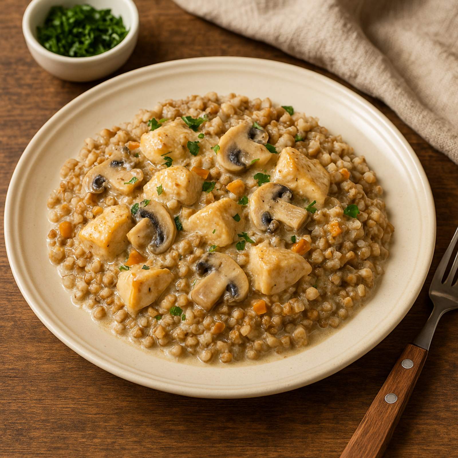 2️⃣ Добавьте курицу: нарежьте филе небольшими кусочками, добавьте к грибам, обжаривайте 5–7 минут.