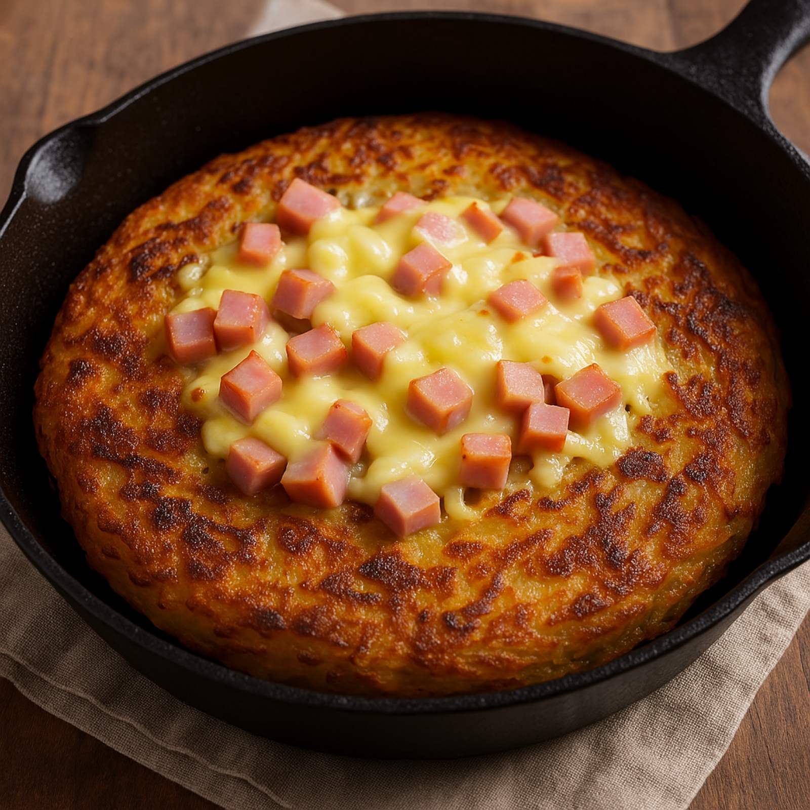 Решти – это классическое блюдо швейцарской кухни, которое напоминает драники, но готовится без муки и яиц. Оно было традиционным завтраком крестьян в кантоне Берн и со временем стало популярным во всей стране. Этот вариант решти получается более сытным и ароматным благодаря добавлению ветчины и плавленого сыра.