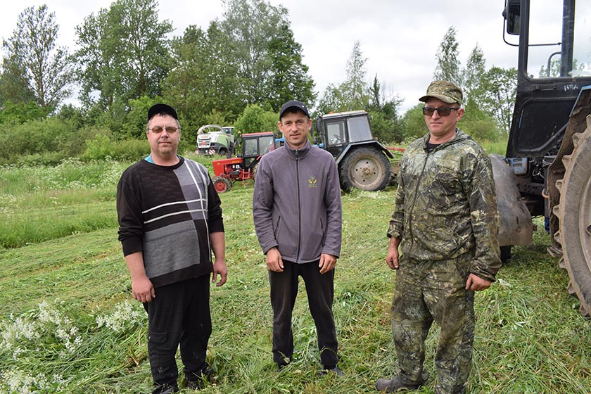 У СУП «Лаўжанскае» ва ўрочышчы Мазурына на МТЗ-1221 з касілкай рупіцца Віталь Чарткоў. «За дзень спраўляюся з 15-20 гектарамі, можна было б і больш, бо шырыня захопу касілкі амаль тры метры, – кажа механізатар. – Але пакуль аб’едзеш нізіны, дзе стаіць вада, губляецца час, паедзеш прама – рызыкуеш забуксаваць. Касавіцу вяду выбарачна – іншага выйсця няма. Касіў ва ўрочышчах Скавародзіна і Пушча – там такая ж сітуацыя. Скажу адно: складана, але працаваць трэба». Па дамоўленасці паміж кіраўнікамі гаспадарак у «Лаўжанскі» на МТЗ з касілкай прыехаў Аляксандр Вяеўнік з КУСГП «Ульскі». Сустрэлі як роднага, усміхаецца Аляксандр, бо гаспадарка мае патрэбу ў памочніках. На МТЗ з граблямі працуюць Андрэй Хадзюкоў і Андрэй Аўсянкін. Калі выглядвае сонца ці ёсць вецер – трава падсыхае хутка. Затым да работы на кормаўборачным камбайне “Ягуар” прыступае Уладзімір Мазанкоў – падбірае і здрабняе траву. Іншыя механізатары яе возяць як у сянажную траншэю, так і на жывёлагадоўчы комплекс на корм маладняку.