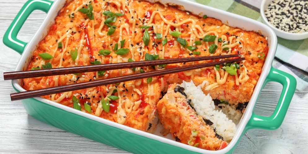 Ленивые запеченные роллы в домашних условиях превратились в очень популярное блюдо. Процесс можно назвать нашествием суши-запеканок. Неизвестно как на это взирают японцы, но всем остальным, кто пробует, такая еда очень нравится. Причем ингредиенты для рецепта ленивых запеченных роллов могут полностью совпадать с теми, что используются для классических запеченных роллов. Дело только в форме. В форме этих самых «роллов» и в форме для запекания, в которую слоями выкладывается традиционный рис для суши, начинка и «шапочка», а затем все это делится и дружно съедается компанией. Каждый заворачивает кусочек суши-запеканки в маленький листочек нори — и вот они, ленивые запеченные роллы в домашних условиях.