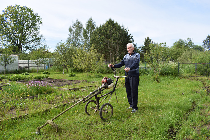 А вось Віктар Ладноў будуецца на ўчастку, які купіў на аўкцыёне. Ёсць добрая лазня, гараж з неабходнымі інструментамі. Праведзена дрэнажная сістэма. У будучым на ўчастку плануе ўзвесці вялікі дом. Сам гаспадар з рукамі – прыстасаваў звычайны трымер на калёсы.