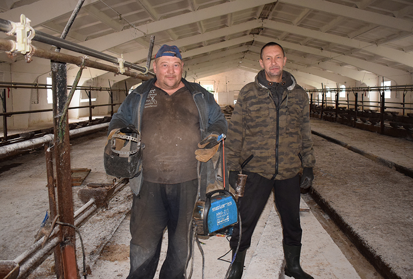 На ферме Ляжні‑3 за работай мы заспелі зваршчыка Сяргея Арапава і слесара Сяргея Карпушчанку. Яны расказалі, што рамантуюць стойлавае абсталяванне. Вядуцца рамонтныя работы і на ферме Ляжні‑2. Галоўная праблема тут – выбітая месцамі падлога з‑за таго, што гной выдаляўся трактарам. Але ж яе рэальна ў сціслыя тэрміны давесці да ладу.