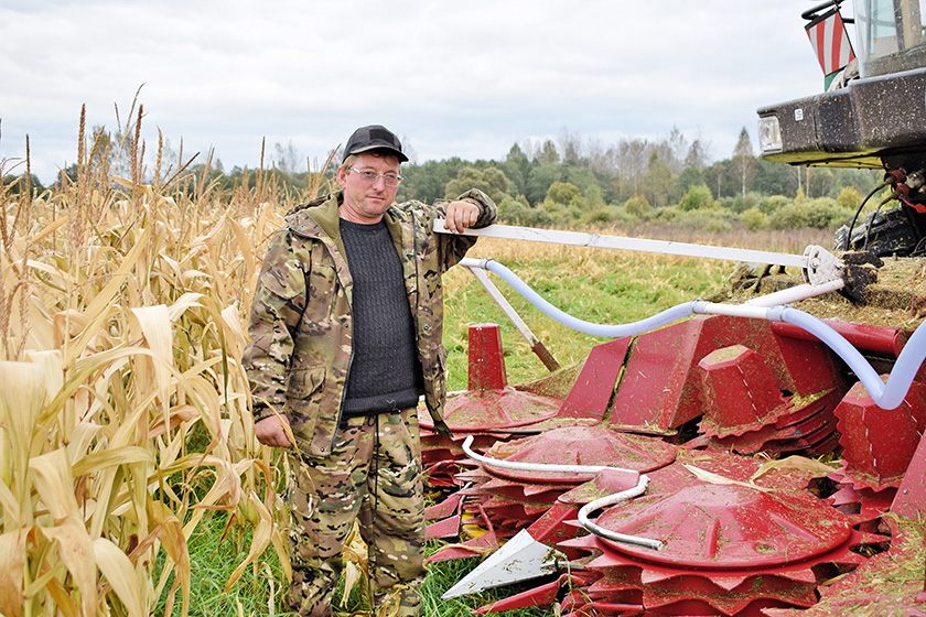 Аляксандр Вяеўнік сёлета ўпершыню працуе на ўборцы кукурузы. Кажа, што работы патрабуюць асаблівай уважлівасці, трэба сачыць за тым, ці аптымальная вышыня зрэзу сцябла, ці на патрэбную адлегласць пад’ехаў трактар з прычэпам. Усяго за дзень механізатар здрабняе да 150-160 тон кукурузы. Змог бы і больш, калі б удосталь было тэхнікі на адвозцы.