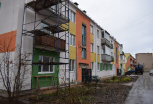 Аднаўляюць пакой адпачынку. Падчас нашага прыезду рабочая будаўнічай брыгады Ганна Васільева фарбавала валікам сцены ў ярка ружовы колер.