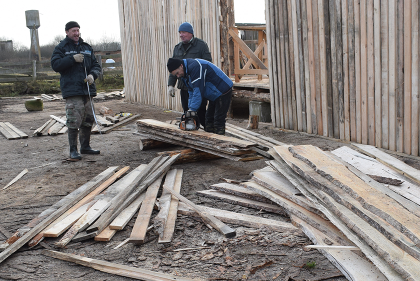 Будаўніцтва драўлянага прафілакторыя пачалі амаль два тыдні таму і мяркуюць закончыць да канца лістапада. А працуюць тут шэфы – работнікі аддзела па адукацыі. З піламі і дошкамі ў руках мы засталі каля фермы рабочых Обальскай СШ Генадзя Чарвінскага, Уладзіміра Садоўскага, Андрэя