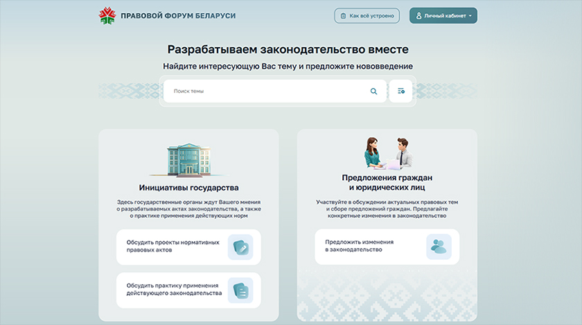 С применением передовых подходов в дизайне Правовой форум Беларуси значительно преобразился. Он приобрел современный и удобный интерфейс, новый логотип и другие фишки, сохранив при этом роль ключевой государственной платформы для открытого участия граждан в нормотворческой деятельности.