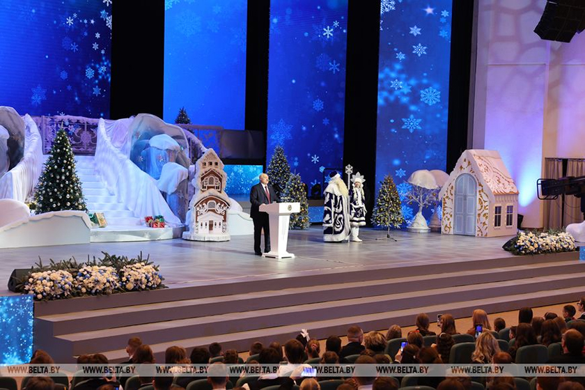 «Я ўжо вельмі шмат нагаварыў і пра працу, і пра вучобу. Ведаю, што вы не толькі дзеля гэтага прыехалі сюды. Можа, вы паглядзелі ўжо на Дзеда Мароза і Снягурачку. І вы, і я, і мільёны людзей, якія вас убачаць, чакаюць гэтага чараўніцтва ад нашых Дзеда Мароза і Снягурачкі», — заўважыў Аляксандр Лукашэнка і прапанаваў дзецям падзякаваць гэтым казачным персанажам за свята.
