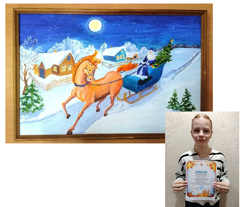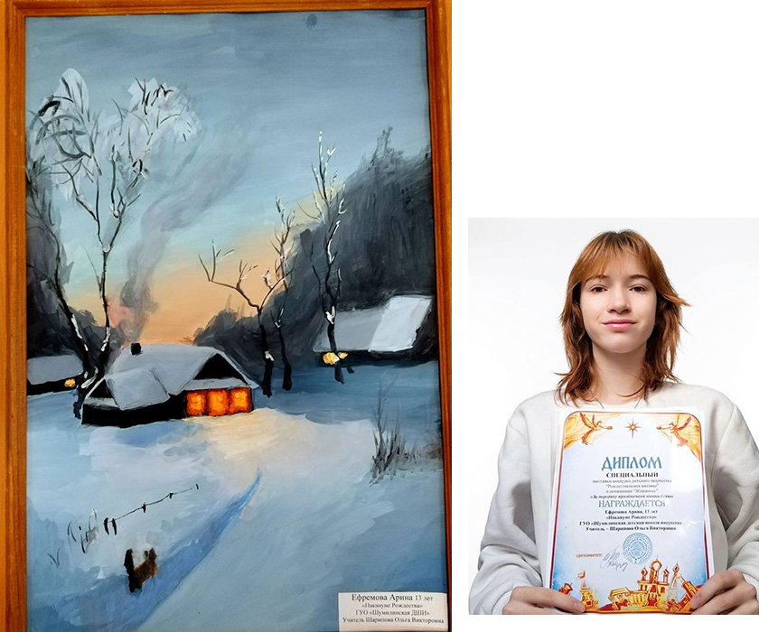 Вучаніца выяўленчага аддзялення Ганна Сарокіна (работа «Новы год да нас імчыцца») і Арына Яфрэмава («Напярэдадні Калядаў») атрымалі спецыяльныя дыпломы «За перадачу святочнай атмасферы».