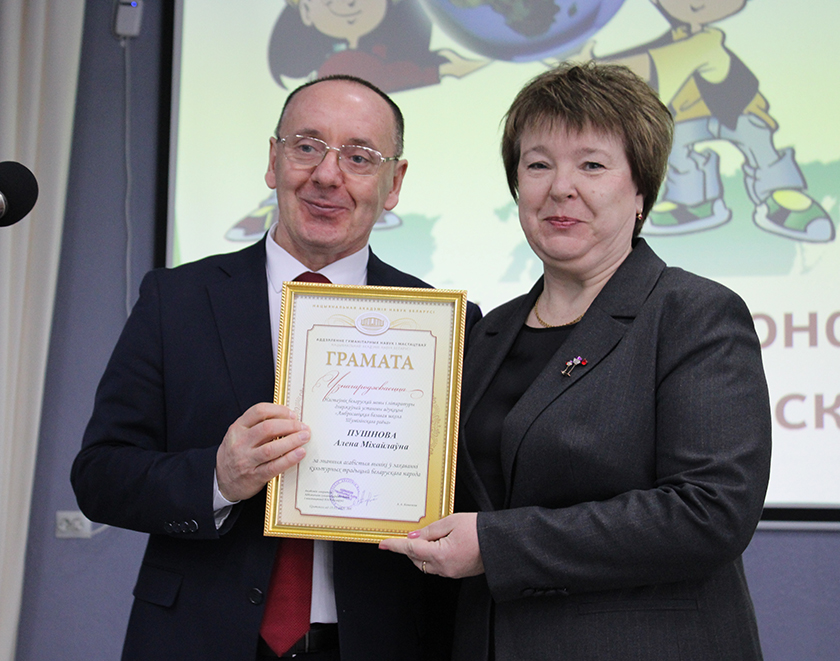 Дырэктар Інстытута мовазнаўства Ігар Капылоў уручыў Грамату інстытута настаўніку Амбросавіцкай БШ Алене Пушновай, аддзелу па адукацыі райвыканкама – «Лексічны атлас беларускіх народных гаворак».