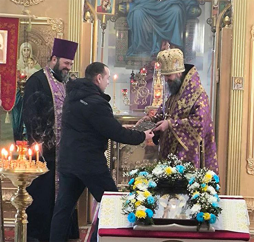 У храме прападобнага Ануфрыя Вялікага Праасвяшчэнны Яўсевій здзейсніў Божую літургію ў саслужэнні благачыннага Шумілінскай акругі протаіерэя Фёдара Пучынскага і настаяцеля Свята-Ануфрыеўскага храма Уладзіміра Пучынскага.